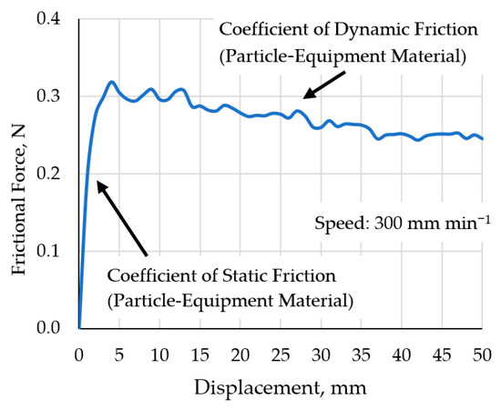 The frictional force–displacement relationship for granules placed in a ring 16 mm high and 103 mm in diameter is shown in Figure 6. As can be seen from this dependence, the dynamic friction coefficient tended to decrease as a result of the change in the position of the tensioned granules within the ring and the change in their position relative to the plate. Here, the static coefficient of friction between the granules and the stainless-steel surface was evaluated during the first two seconds of the study, while the dynamic coefficient of friction between the granules and the stainless-steel surface was determined for the remaining 8 s of the study. The software of the friction coefficient determination automatically calculated the static friction coefficient from the first 2 s of friction force results and automatically calculated the dynamic friction coefficient from the average of the remaining 8 s of friction force results (Figure 7).