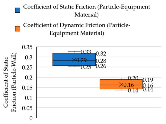 Box plots charts of granule-particle–equipment-material static and kinetic coefficients of friction.