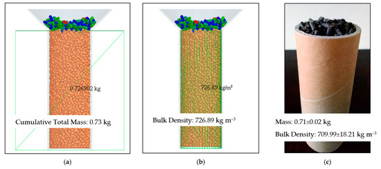 As can be seen from the results, the mass of the granules poured into the cylindrical container of about 1.00 l was 0.73 kg in the simulation, which was 2.7% more than the experimental result. For the bulk density of the granules in this container, the value obtained in the simulation was 726.89 kg m−3, which was 2.3% higher than the experimental value.