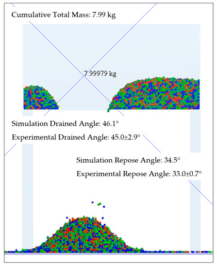 The next study on the modeling of the drained and repose angles of the granular structure continued the calibration studies of the selected granular material properties. The results of these investigations are presented in Figure 9. The drained and repose angles of the granules obtained from the simulation were measured using the software tools, and only the values are shown in this figure. The values of the drained and repose angles obtained from the experiments are shown next to the simulation results, together with the confidence interval. The simulation showed that the natural repose angle of the granules was about 2.4%, and the drained angle was about 4.5% higher than the experimental values for these angles. Moreover, when the visual simulation results were compared with the experimental results, the shape of the drained granule pile and the distribution of the drained granules on the ground were very similar to the experimental images, one of which is shown in Figure 2. The visual assessment also showed a good agreement between the experimental and simulated images of the granule repose angles.