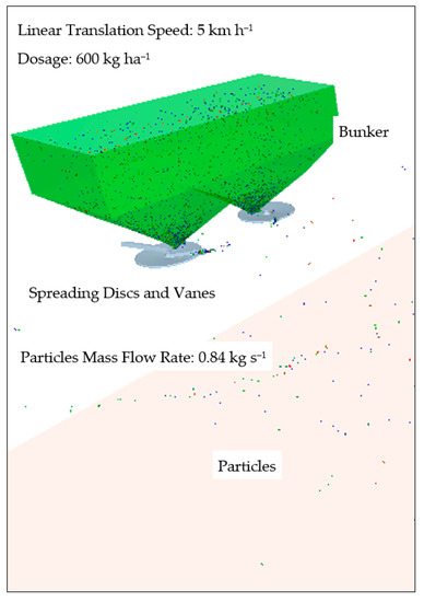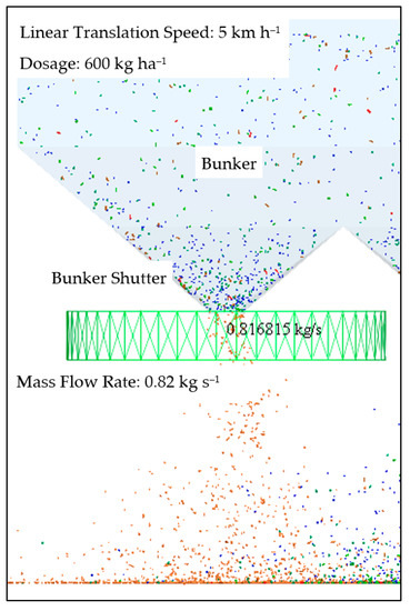 Prior to fertilizer spreading, measurements were made of the spreader‘s fertilizer mass flow through one bunker shutter. For this purpose, one disc of the spreader was removed and replaced by a special fertilizer-collecting container. The spreader was then driven for a certain distance at the required spreading dosage norm and at speeds of 5 and 10 km h−1. The mass flow of the fertilizer was estimated from the mass of the granules crumbled in the container. This measurement of the fertilizer mass flow rate was carried out several times with the spreader until the obtained value of the flow rate was close to the theoretical value. For example, at a fertilizer spreading dosage norm of 600 kg ha−1 and with the tractor and spreader movement at a speed of 5 km h−1, the theoretical value of the fertilizer flow rate through one bunker shutter is 0.83 kg s−1. In addition to the experimental studies on the determination of the fertilizer flow rate, modeling studies were carried out on the flow rate of fertilizer crumbling through a single bunker spreading shutter. The duration of the simulation study was 3 s, and the average flow rate was calculated after approximately 1.5 s of the study.
