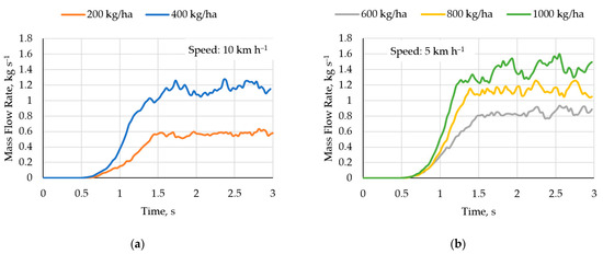 Time-dependent flow rate simulations of fertilizer crumbling through a single bunker shutter: (a) mass flow rate at spreading dosage norms of 200 and 400 kg ha−1 and with the spreader model moving at a speed of 10 km h−1; and (b) mass flow rate at spreading dosage norms of 600, 800, and 1000 kg ha−1 and with the spreader model moving at a speed of 5 km h−1.