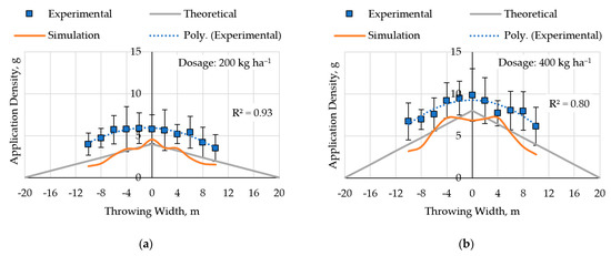 Experimental, theoretical, and modeled distribution of fertilizer mass across the spreader’s throwing width when driving speed is 10 km h−1, working width is 20 m, and throwing width is 40 m (a) Fertilizer spreading dosage norm of 200 kg ha−1 and (b) fertilizer spreading dosage norm of 400 kg ha−1.