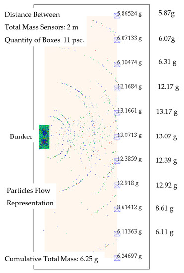According to the above-described spreading modeling methodology, Figure 12 shows the results of spreading across the spreader’s throwing width at the fertilizer spreading dosage norm of 200 and 400 kg ha−1. The image of the double-disc spreader model used during the spreading simulation with part of the spread fertilizer is presented in Figure 13. This model consisted of a bunker with two discharge shutters, two rotating fertilizer spreading discs, and fertilizer spreading vanes. The results of fertilizer spreading across the throwing width were obtained in the discrete element simulation program by using granule mass collection sensors, which, in their size and placement in the spreading field, were identical to the spread fertilizer collection boxes used in the experiment. An image of the layout of the collection boxes used during these simulations and the amount of accumulated fertilizer in each of them are presented in Figure 14. Here, we offer a top view; the fertilizer bunker is on the left, and the fertilizer spread flow is shown between the bunker and the boxes. In this figure, simulation results were presented when the spreading dosage norm was 600 kg ha−1 and the spreading model linear movement speed was 5 km h−1. The results of the simulation of the remaining spreading dosage norms are presented only in the diagrams next to the results of experimental studies and the theoretical fertilizer spreading lines.