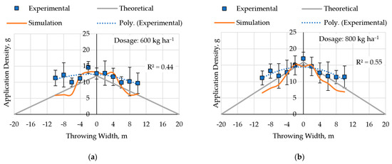 Experimental, theoretical, and modeled distribution of fertilizer mass across the spreader’s throwing width when driving speed is 5 km h−1, working width is 20 m, and throwing width is 40 m. (a) Fertilizer spreading dosage norm of 600 kg ha−1 and (b) fertilizer spreading dosage norm of 800 kg ha−1.