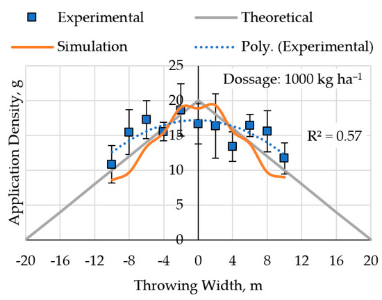 From the results of the granulated organic fertilizer spreading, using a fertilizer dosage norm of 1000 kg ha−1 and the spreader moving at a speed of 5 km h−1 (Figure 16), we can see that slightly different experimental results were obtained here compared to the results presented in Figure 12 and Figure 15. Here, it was found that the values of granule mass obtained during the experiment were lower than the theoretical values. The main reason for this discrepancy is that, during the experimental calibration of the fertilizer flow, the spreader achieved a lower-than-required flow of fertilizer dispersal through the bunker shutter. Nevertheless, we can see that this scattering was performed correctly, and the results that were obtained are reliable.