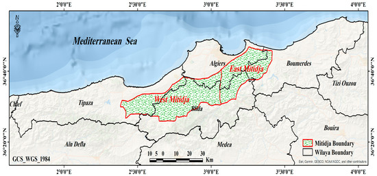 The Mitidja Plain is a narrow, 100 km long littoral plain located in the Center of Northern Algerian (Figure 1). It extends over an area of about 1450 km2, and it borders the east of the Mediterranean Sea and the north of the Sahel Mountains. To the south, it encloses the Blida Atlas, and to the west, by the mountains of Dahran, it encompasses a latitude of 36° [24]. The soils of this plain are considered the most fertile in Algeria.