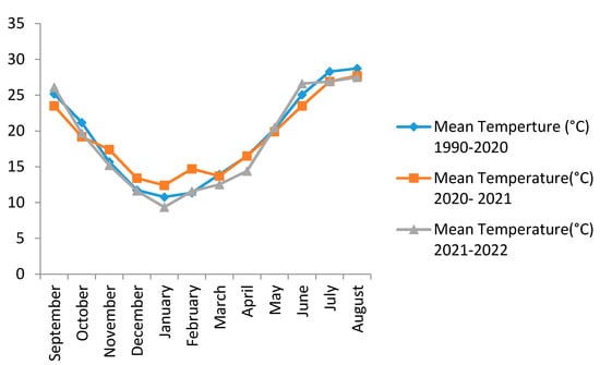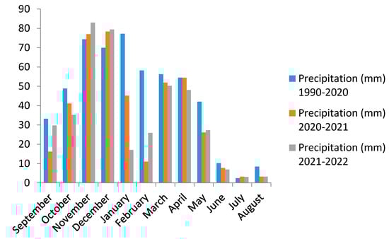 Figure 2 presents monthly temperature and precipitation data for the experimental site, for two separate agricultural campaigns (“2020–2021” and “2021–2022”), as well as for the period from 1990 to 2020. The cumulative annual rainfall for the 2020–2021 season was 576.1 mm, and, for 2021–2022, it was 460.3 mm (weather data from the station), corresponding to a normal climatic year. This cumulative annual rainfall between 450–600 mm has been recorded since 2019–2022. During the crop development cycle, 162.8 mm of rain was recorded between December and January. Subsequently, 167.9 mm of rainfall occurred between February and June. The cumulative rainfall for the period of the vegetative cycle of wheat is 330.7 mm in the first year, and it is 320.8 mm in the second year [26].