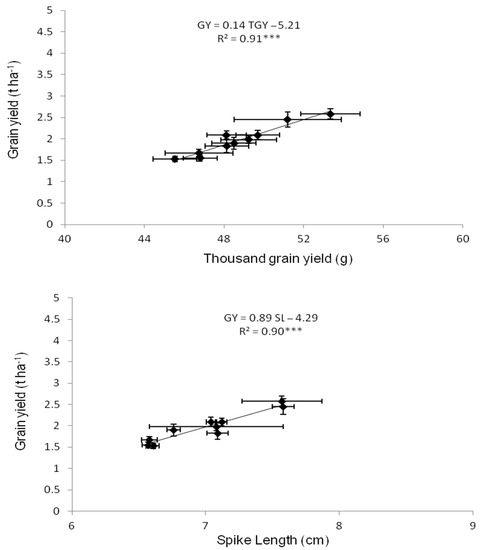 Regression equations for the relationship of grain yield (GY) to spike length (SL) and thousand-grain weight (TGY). Asterisk “***” denotes significant difference p ≤ 0.001, respectively. All plotted data are the mean of five replicates for each measured variable. Linear regression was established between GY and both SL and TGY mean values measured during the two cropping seasons and under each K-level treatment. The bars represent standard errors from five replicate of either GY (vertical bare) or SL and TGY (horizontal bar) mean values.