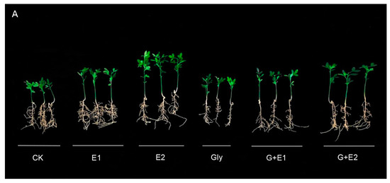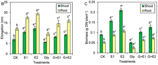Effects of Gly with or without EWC-DOM on development of citrus seedlings. (A) Growth chart of citrus seedlings. (B,C) Elongation and dry mass, respectively, of citrus shoots and roots. The data represent the mean of three replications (means ± SD, n = 3). There are no obvious differences between treatments represented by identical letters at p < 0.05 levels, the asterisk (*) denotes that these values differ substantially from those of the control (ANOVA, p < 0.05).