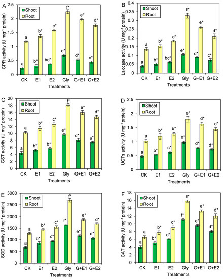 CPR is an indispensable component of the cytochrome P450s system, which transfers electrons from NADPH to P450s enzymes to maintain the performance of phase I metabolism pathways, the rate-limiting steps in the metabolism of foreign chemical substances in plants [33,34,35]. As shown in Figure 3A, the glyphosate-induced distinct rise (by 207% in the shoot and 90% in the root) in CPR activity detected in this study was drastically down-regulated via EWC-DOM involvement (by 23% (G + E1) and 35% (G + E2) in the shoots and by 13% (G + E1) and 22% (G + E2) in the roots (p < 0.05) (Figure 3A).