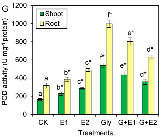 In Gly treatment, to deal with glyphosate-induced oxidative damage, SOD activities were increased to 139% and 111% of the control in the shoots and roots of citrus seedlings, respectively, which were then down-regulated through the involvement of EWC-DOM by 29% (G + E1) and 36% (G + E2) in the shoots, and by 31% (G + E1) and 37% (G + E2) in the roots (Figure 3E). These results indicated that SOD could sensitively respond to the glyphosate-induced oxidative stress, and the involvement of EWC-DOM could alleviate glyphosate-induced ROS stress as reflected by the decreased membrane lipid peroxidation level (Figure 2B), thus, no longer requiring such high SOD activities.