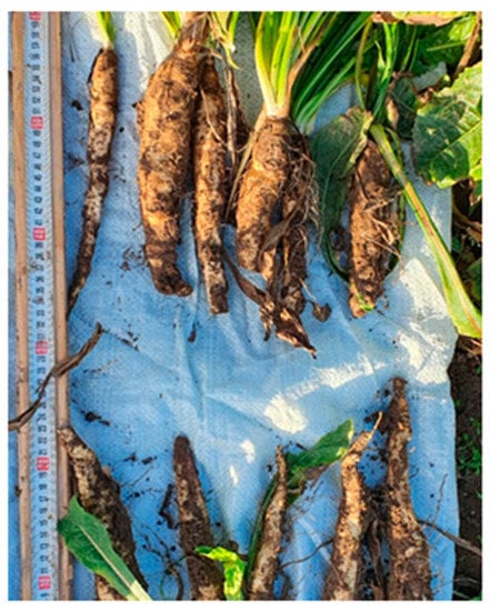 For the field experiment we chose the root chicory (Cichorium intybus) of the Petrovsky variety (Figure 1), which was selected by scientists from the Rostov Vegetable Chicory Experimental Station, Rostov, Yaroslavl region, Russia [26]. This variety has a well-leafed rosette, a large leaf surface area (6583.4 cm2), and is a short-rooted variety, which accelerates the harvesting process due to the use of special forage harvesting equipment. This, in turn, significantly reduces the cost of production.