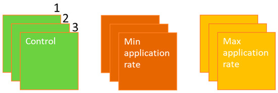 All treatments were applied with a backpack sprayer “Finland” for 5 L poured 0.4 L solution. The entire volume was completely sprayed onto one plot (12 m2), spread evenly over the entire area of the plot. After processing three plots with the minimum concentration, the plots with the maximum concentration were treated. Before changing the herbicide, the sprayer was flushed with clean water. The experimental design for one pesticide active ingredient is shown in Figure 2.