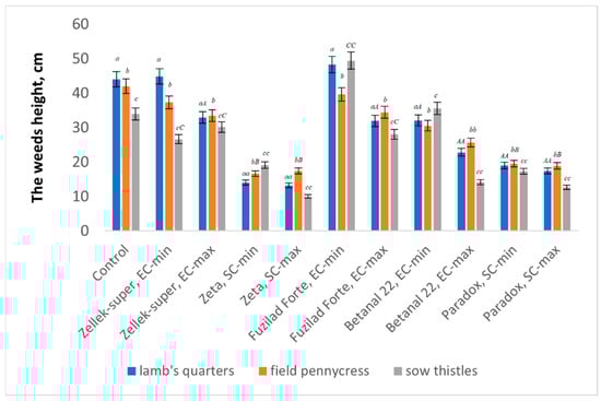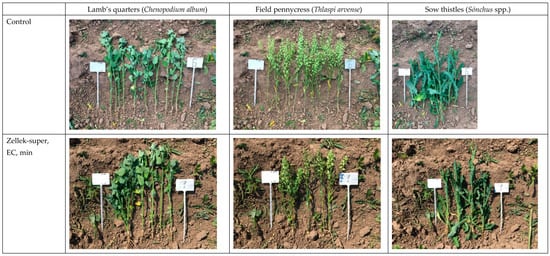 The damage to weeds and chicory was evaluated 2 weeks after herbicide treatment. On each plot, the heights of three prevailing weeds—lamb’s quarters (Chenopodium album), field pennycress (Thlaspi arvense), and sow thistles (Sonchus spp.)were taken into account (Figure 3). There were no cereal weeds on the field.