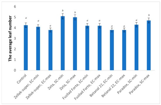 Average number of leaves per chicory plant in plots treated with different herbicides (excluding cotyledons). The different letters on bars indicates significant difference (α < 0.05).