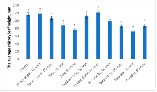 Average chicory leaf height in herbicide-treated plots. Error bars indicate the confidence interval at α = 0.05. The different letters on bars indicates significant difference (α < 0.05).