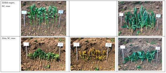 Herbicide treatment was carried out on 20 June 2022 in the phase of 2–3 true leaves of crop development, at a plant height of 2–5 cm. The pesticides were applied according to the minimum and maximum application rates (Table 1).