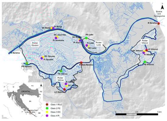 Among Class 1 R/LC, R Mala Neretva and LC Vidrice are the locations most influenced by seawater due to their proximity to the Adriatic Sea. For Class 2 PS, most of the saltwater is collected at PS Luke and PS Vidrice. However, different processes are responsible for such a picture. Polder Luke is under the strong influence of the stratified flow of the Neretva River, and the saline water from the river that enters the polder is discharged by continuous pumping towards the monitoring location PS Luke. Although the operation of the pumping station diverts and collects water from the entire polder, the contribution of PS Luke to nutrients is low, which is due to poor land use, many abandoned parcels, and the low intensity of agricultural production in this polder. In contrast to PS Luke, the nutrient contribution of PS Vrbovci was higher, which was due to the intensive use of agricultural land. At PS Vidrice, there was a mixed influence of fresh and saltwater due to its position in the polder. PS Vidrice is located on the left bank of the Mala Neretva River and pumps the collected water from the Vidrice polder into the river. As a result of proximity and the fact that the Mala Neretva River is at a higher elevation than the pumping station, PS Vidrice is influenced by freshwater from the Mala Neretva River (contributions of Ca2+ and HCO3−). Last, PS Opuzen, although closest to the sea, showed very little to no contribution to salinity, which is due to the dominant freshwater inflow from the entire polder area rather than SWI at the pumping station. The intensive agricultural production of fruits and vegetables in this area contributes to some extent to nutrient loadings.