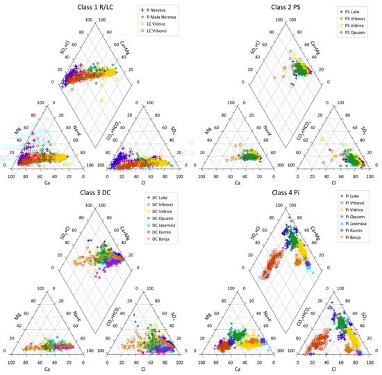 Water bodies belonging to the Class 1 RIVER/LATERAL CANAL (R/LC) were supposed to reflect natural conditions and were mostly unaffected by anthropogenic pressures, although they were considered pristine reference waterbodies. The Class 1 R/LC water bodies are fed freshwater from the catchment. They are least affected by saline water intrusion and are low in nutrients (Table 1). The order of the main cation mean concentrations was Na+ > Ca2+ > Mg2+ > K+, and their concentrations were significantly lower than those in the other water-body classes. Maximum concentrations of all cations and anions except nutrients (N species) indicate the periodical intrusion of the saline water into the river courses, which has been obviously modifying the natural state common for the river water composition, particularly in Class 1 LC Vidrice and R Mala Neretva, which are located closest to the sea (Figure 1).