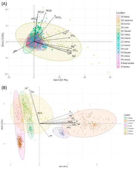 PCA biplots for (A) all three classes of surface-water bodies and (B) groundwater.