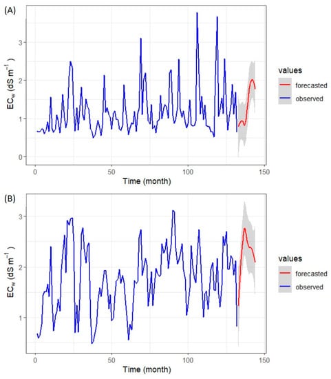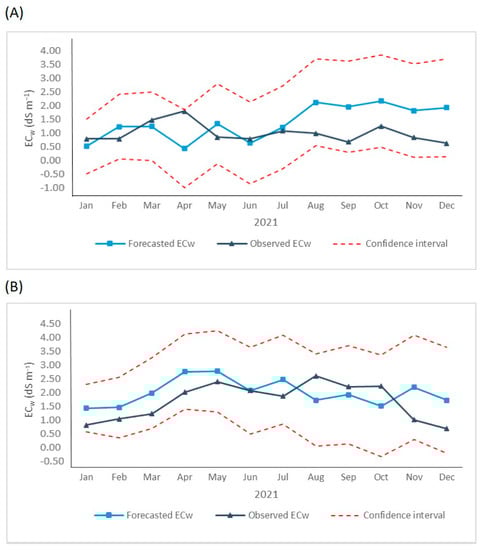 Model validation is an important part of multivariate data analysis. Model validation is used to compare model predictions with the observed and unknown data set to assess model accuracy and predictive ability [,]. The observed ECw data from 2021 were plotted with forecasted data for 2021, including confidence intervals at the Class 1 R/LC locations R Mala Neretva (Figure 5A) and LC Vidrice (Figure 5B). Visually, all observed and predicted data points at both locations fall between the lower and upper bounds of the confidence interval. To check the goodness of fit of the model, RMSE values were calculated. The calculated RMSE was 0.8 dS m−1 (Table 5) at Class 1 R/LC location R Mala Neretva and 0.66 dS m−1 at LC Vidrice.