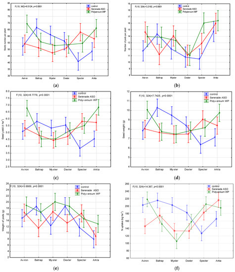 Polyversum WP and Serenade ASO negatively affected nitrogen uptake by the seeds. However, the use of Polyversum WP increased nitrogen uptake on average by 10 kg ha−1 relative to Serenade ASO.