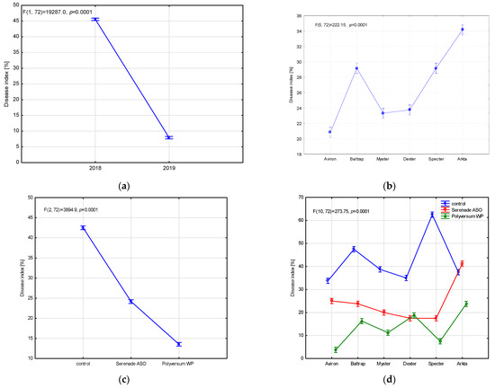 Ascochyta blight affected the pea cultivars more severely in 2018 (Figure 6a). In that season, the A. pisi disease index ranged from 5% (protected treatments) to 77.5% (control) (Figure 7). In 2019, the disease index ranged from 0% (protected treatments) to 50.0% (control) (Figure 8). The Baltrap cultivar was significantly the most severely diseased by A. pisi in both years of the experiment, followed by Specter and Arkta (Figure 6b). In both seasons, the use of protection significantly reduced infection of all pea cultivars with A. pisi (Figure 6c,d), but the biological products provided better protection in 2018 (Figure 7 and Figure 8).
