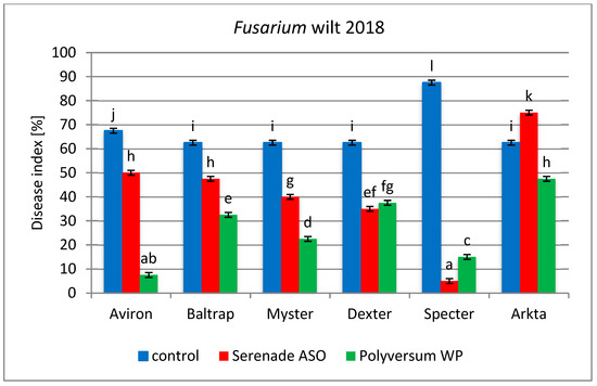 Occurrence of Fusarium wilt in 2018 on pea cultivars protected using biological agents. Means with different letters are significantly different (p < 0.05).