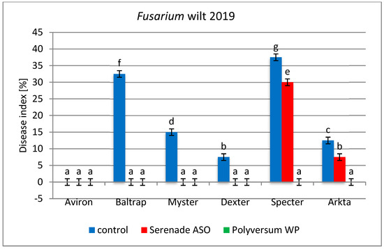 In the 2018/2019 season, significantly, the highest disease index was 37.5% for the Specter cultivar in the treatment without protection (Figure 5), while the disease was not observed in the Aviron cultivar. Application of Polyversum WP and Serenade ASO effectively protected the plants against Fusarium wilt. The disease was observed only in the Specter and Arkta cultivars sprayed with Serenade ASO. The plants in the other treatments were healthy (Figure 5).