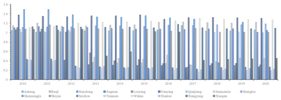 Overall, as shown in Figure 1, the agricultural eco-efficiency value in the HRB shows a decreasing trend from 2010 to 2020. Specifically, from 2010 to 2012, the agricultural eco-efficiency value in the HRB was at a relatively high level, with an average efficiency value of about 0.98; the fluctuation of agricultural eco-efficiency in the HRB decreased from 2013 to 2020, with an average efficiency value of approximately 0.79. Among them, cities in the upper reaches of the HRB have shown a trend of increasing efficiency values, such as Ankang City, Baoji City, Shangluo City, and Wuhan City, which has a higher level of economic development in the lower reaches. There is a general trend of declining agricultural efficiency levels in other cities, especially Suizhou City, Tianmen City, and Xiantao City. Analyzing the reasons for the decline in agricultural eco-efficiency level from the perspective of input-output relaxation variables, it may be due to production congestion caused by excessive input factors, which leads to a decrease in output, i.e., the factor crowding phenomenon, making production factors unable to be fully and effectively utilized [15,47]. The obvious redundancy of diesel, pesticide, and agricultural film input in these areas indicates that the input of agricultural means of production is not fully utilized, which leads to an increase in agricultural non-point source pollution and carbon emissions, thus worsening agricultural ecological efficiency.