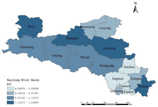 From the perspective of the watershed, the spatial distribution of agricultural eco-efficiency in the HRB is as follows: upstream > middle reaches > downstream (Figure 2). The average efficiency in the upstream, middle, and downstream areas is 12.15, 9.40, and 6.67, respectively. Among them, from the perspective of input-output factor redundancy, the reason for the lowest agricultural eco-efficiency value in downstream cities is analyzed. Tianmen City, Xiantao City, and Xiaogan City have a high degree of redundancy in energy input. Insufficient utilization of diesel can lead to energy waste and environmental pollution, which create dual pressure on the local economy and environment. Since 2016, the state has actively implemented crop seed subsidies, direct subsidies for grain farmers, and comprehensive agricultural subsidies (called “three subsidies”) for farmers, which mobilized production enthusiasm and eased economic pressure [48]. However, there is serious spatial differentiation of agricultural eco-efficiency in the HRB, with generally high efficiency in the upper reaches and serious agricultural land, air, and carbon pollution problems in the lower reaches. Based on the analysis of the data in this study, it appears that cities in the upper HRB use fewer inputs of agricultural production materials, such as agricultural films, pesticides, and mechanical power. This may be due to the rugged terrain in the upper reaches and the different grain cultivation structure between the middle and lower reaches, with a higher proportion of corn and a lower proportion of rice in the upper reaches of the HRB. At the same time, the large number of laborers employed in the cities also directly leads to a decrease in agricultural efficiency [49]. And the downstream cities, such as Suizhou, Jingmen, Tianmen, and Xiantao, have not yet undergone any fundamental changes in their highly resource-intensive agricultural operations, and there is a lack of green production and low-carbon technologies. Therefore, in 2018, the country launched the Han River Ecological Economic Belt Development Plan, which aims to promote the high-quality development of the ecological economic belt in the middle and lower reaches.
