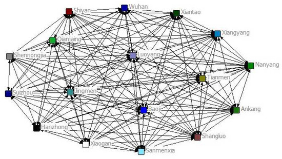 The spatial relationship matrix of agricultural eco-efficiency in the Hanjiang River basin is constructed through the modified Gravity model, and the evolving structure of the network relationship of agricultural eco-efficiency is characterized by the indicators of the social network analysis method (Figure 3 and Figure 4). The overall network structure is able to express rules and resources, which in the spatial network of agricultural eco-efficiency in the HRB refers to the rules used by urban actors to reproduce social relations in a longer space and time period and the resource dominance of cities in authoritative positions. The mean value of the spatial density of agricultural eco-efficiency in the HRB from 2010 to 2020 is 0.17, and the network hierarchy increases from 0.34 to 0.48, which indicates that the degree of closeness among administrative units in the basin is low and does not form a complex network, making it difficult to bring inter-individual reciprocity into play, and the structural role of the network has less impact on individual cities. The average efficiency of the agricultural eco-efficiency spatial network in the HRB from 2010 to 2020 was 0.89, indicating that individuals within the basin have high stability in connecting to the network structure. This means that the mobility of factors between the two cities is poor, making it difficult to promote factor flow through the agricultural eco-efficiency spatial correlation network and reducing the comparative advantage between cities [32]. This requires synergistic basin-wide policies. To promote overall efficiency, cities must interact to facilitate the flow of capital, labor, information technology, and other factors.