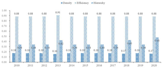 Whole Network Structure Characteristics of Spatial Correlation of Agricultural Eco-efficiency in the HRB.
