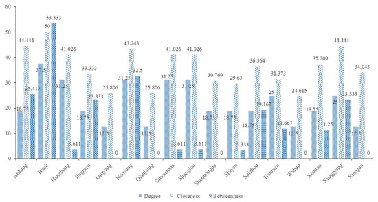 - Degree centrality. According to Figure 5, it can be found that Baoji City ranked high in terms of degree between 2010 and 2020, with a value of 37.5. Baoji City is located in the upper reaches of the HRB and belongs to Shaanxi Province. Generally speaking, as the core city where the agricultural eco-efficiency generates the spatial correlation of factors, the mobility of agricultural means of production, technology, capital, and other factors makes the ecological efficiency of the region play a positive role, and through spatial spillover to neighboring provinces, it improves the degree of output, thus obtaining a higher degree of centrality. However, the overall ranking of the lower reaches of the Han River is relatively low, and its efficiency and spatial trading ability are poor. This may be due to the geographical edge of downstream areas and the high level of industrial and economic development, resulting in a significant difference in agricultural eco-efficiency values from surrounding provinces and less spatial correlation behavior.