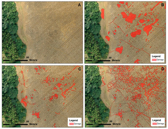 Part of the study area, showing different levels of damage detection based on the three methods. Note: (A) = orthophoto of part of the damaged field, (B) = damage detected using the Ground-Based Assessment, (C) = damage detected using the UAS Crop Height Method, (D) = damage detected using the UAS with Operator Delineation Method.