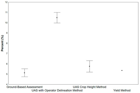 A significantly more accurate estimate was achieved, with less cost, by the Ground-Based Assessment and using the UAS Crop Height Method. The difficulties associated with the UAS Crop Height Method can be divided into three components: (i) the actual field work required; (ii) the office work required; (iii) the time needed to calculate the models. In our case, field work meant the distribution and measurement of ground control points and the actual drone photography time, totalling around 1 h per photography session (before and after harvest). The manual office work consisted of marking the insertion points on the images and the actual analysis of the data, totalling around 3 h, while the time needed to calculate detailed 3D models of the surface and terrain came to around 10 h. On the other hand, the model calculation required no manual input and, as such, the 10 h refers only to “machine time”. The second drone session, used to obtain a terrain model, can be omitted when a detailed terrain model of the area of interest is already available, e.g., from aerial laser scanning.