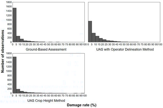 The damage calculated using the UAS with Operator Delineation Method was almost two times greater than that described by the other methods (Figure 2, Table 1), the percentage damage being significantly different at p < 0.001 (Kruskal-Wallis), while a multiple-comparison test indicated no significant difference in the percentage damages detected by the Ground-Based Assessment and UAS Crop Height Method (p > 0.05). A significantly higher damage rate was recorded in the 0–5% class using the Ground-Based Assessment and UAS Crop Height Method, whereas the UAS with Operator Delineation Method recorded around half this rate. On the other hand, the damage rate was significantly higher in classes covering damage of 5–40% using the UAS with Operator Delineation Method (Figure 3). In the case of the UAS with Operator Delineation Method, the occurrence of higher categories was less frequent and the UAS Crop Height Method found the highest value.