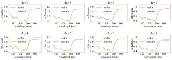 In our opinion, further research directions may also include a comparison of wheat leaf rust with other fungal pathogens. It would be interesting to compare hyperspectral images obtained as a result of plants exposure to other biotrophic and necrotrophic fungi. The use of hyperspectral remote sensing data in the wavelengths of 1100–2500, can also be useful for developing new algorithms for early plant disease detection. The new generation of high-resolution hyperspectral camera usage, may allow more correct classification of inoculated plants at an even earlier time.