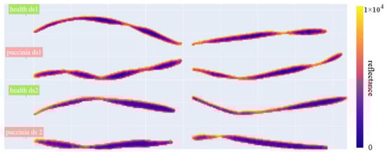 Both of these studies were taken into account. However, the study of Ashourloo et al. had too high of an error rate at early stages of the disease. The study of Bohnenkamp et al. involved the usage of pure fungal spore spectra, as reference, which means high-disease severity. Consequently, our study was based on the methodology of Gold et al. (2020) [14], supplemented by a number of innovations.