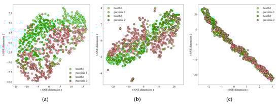 Figure 4. The classes distribution in the multidimensional space of features for images, presented in two-dimensional space using the t-SNE algorithm for cases where the features are (a) average, (b) textural features over pixel intensities in two-dimensional hyperspectral images of each channel, and (c) vegetation indices. The graphs demonstrate good separability of classes in feature spaces in cases where channel averages and texture features are used as features. The feature space built on the basis of vegetation indexes demonstrates worse separability.