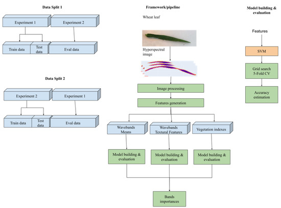 Based on the analysis of hyperspectral remote sensing for early plant disease detection, a number of assumptions were made about the biological experiment design and its successful repetition. Of those applicable to this experiment, we found it necessary to take into account a number of important factors. Firstly, the spectral portraits’ differences can be caused by various abiotic and biotic stress factors [7,35]. Secondly, the presence of a mixed infection can also be important [7,8,36]. Finally, we made an assumption that it may be important to understand what biochemical changes occur inside a diseased plant, in what wavelength range they manifest themselves, and how they can affect the spectral portrait [37,38,39]. We believed that hyperspectral imaging data are determined by the biochemical processes occurring in plants from the first minutes of disease development.