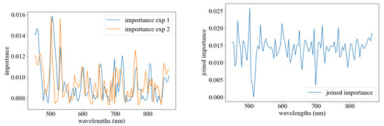 A mutual portability between experiments was observed. The smallest necessary set of wavebands necessary to build a classifier suitable for both experiments was selected. The most important wavebands ordered by importance are 502, 466, 598, 718, 534, 766, 694, 650, 866, 602, 858 nm. Figure 6 shows the channel importance vectors for two experiments (on the left), and the combined importance vector for two experiments (on the right).