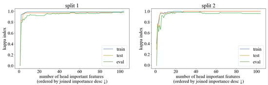 Figure 7 shows the dependence of the model accuracy on the most important wave-bands number used for data split one, on the left, and for data split two, on the right.