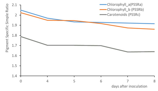 Chlorophylls (a, b) and total carotenoids simple ratio dynamics in wheat leaf rust inoculated leaves measured by hyperspectral, remote sensing, Pigment Specific Simple Ratio by Blackburn (1998): LSD 0.05 = 0.05 [34].