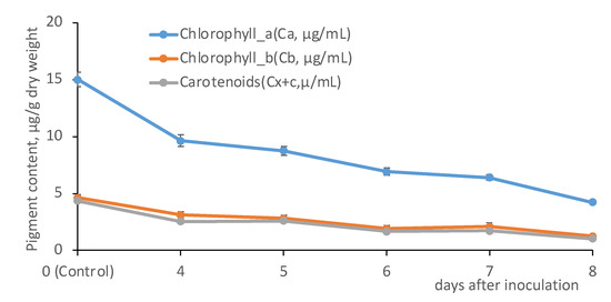 Chlorophylls (a, b) and total carotenoids level dynamics in wheat leaf rust-inoculated leaves measured via VIS-NIR spectrometry by Lichtenthaler and Buschmann (2001); LSD 0.05 = 1.1 [18].