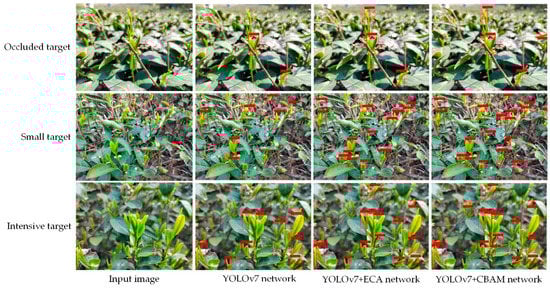 - Multi-leaf, occluding and densely distributed images containing young tea leaves were drawn by Grad-CAM, respectively. It could be seen that the YOLOv7+CBAM network model could accurately focus on different types of images and was little affected by background factors, which further proved that the network proposed in this study had a better effect on improving the recognition effect of famous and excellent green tea.
