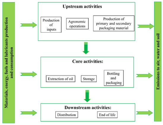 Figure 2 shows the general system boundaries for a cradle-to-gate LCA of olive oil production [53]. This study with a cradle-to-gate approach includes the following upstream and core activities: production of inputs and energy sources, olive production, oil extraction, use and waste management and emissions involved in the production phases. Upstream processes include in and outflows within the farming phase, while core processes include those in the industrial one. The cradle-to-gate approach excludes packaging and downstream processes, so they are not part of this study [27].