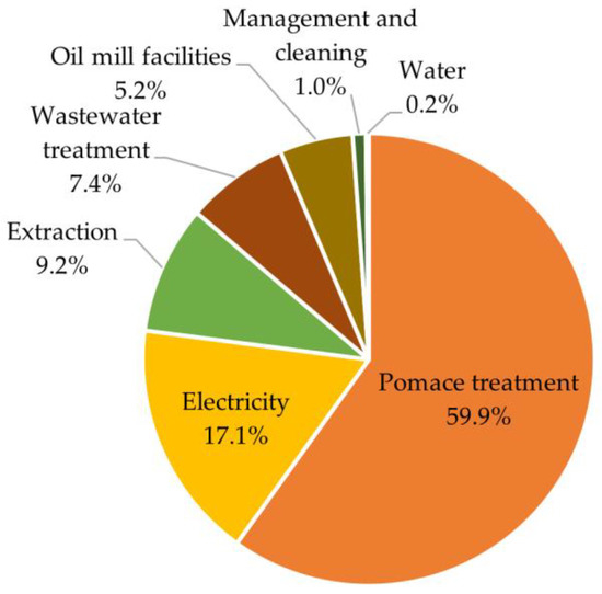 In olive oil production, in addition to the main product, by-products and residues are also obtained, as already stated. However, for the allocation, those with an economic value are paid heed—that is, VOO as the main product and olive stones, crude olive pomace and exhausted pomace olive as by-products. Nevertheless, the treatment of the waste generated has an EI on the phase from which it comes, and this should also be taken into consideration. As for residues, pomace is considered a waste of the OOM, but it has to be mandatorily processed whether it provides low earnings or costs, depending on the current year. This process generates an added EI in olive oil production and its by-products.