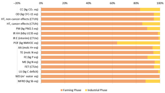 Apart from the comparison with other scientific papers, results have been measured according to recent reports and official documents related to LCA in olive oil production. The most indicated documents to stablish relations are Annex III (benchmark and classes of environmental performance) of the PEFCR [47] and supporting studies such as the Environmental Product Declarations (EPDs) of VOO [69]. According to the first, it is possible to grade, on a scale from E (worst case) to A (best case), the EI obtained in every impact category for the FU considered, in a “cradle-to-gate” scope. In this case, every result is placed in grade A, because the scope of the study covers fewer processes than the ones required. However, by comparing with farming and industrial phases of another EPDs, we could confirm that EI values are intermediate in relation to those obtained by commercial VOO [70,71,72,73].